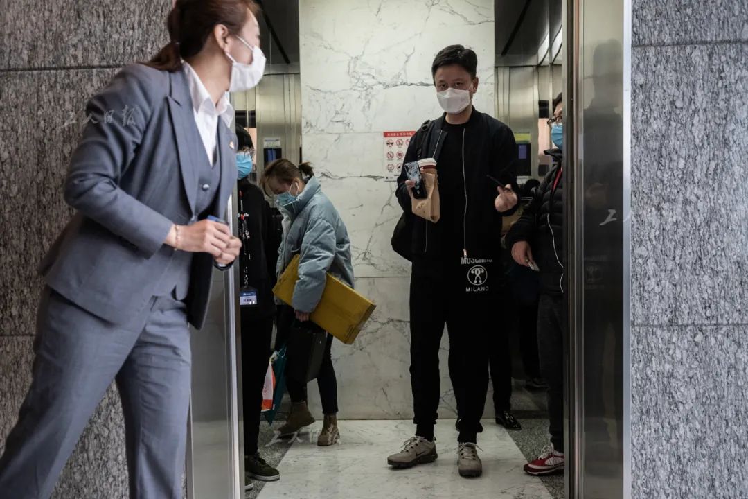 ↑3月30日,一名物业工作人员在电梯口提醒人们保持距离,“每部电梯人数不能超过6人。”