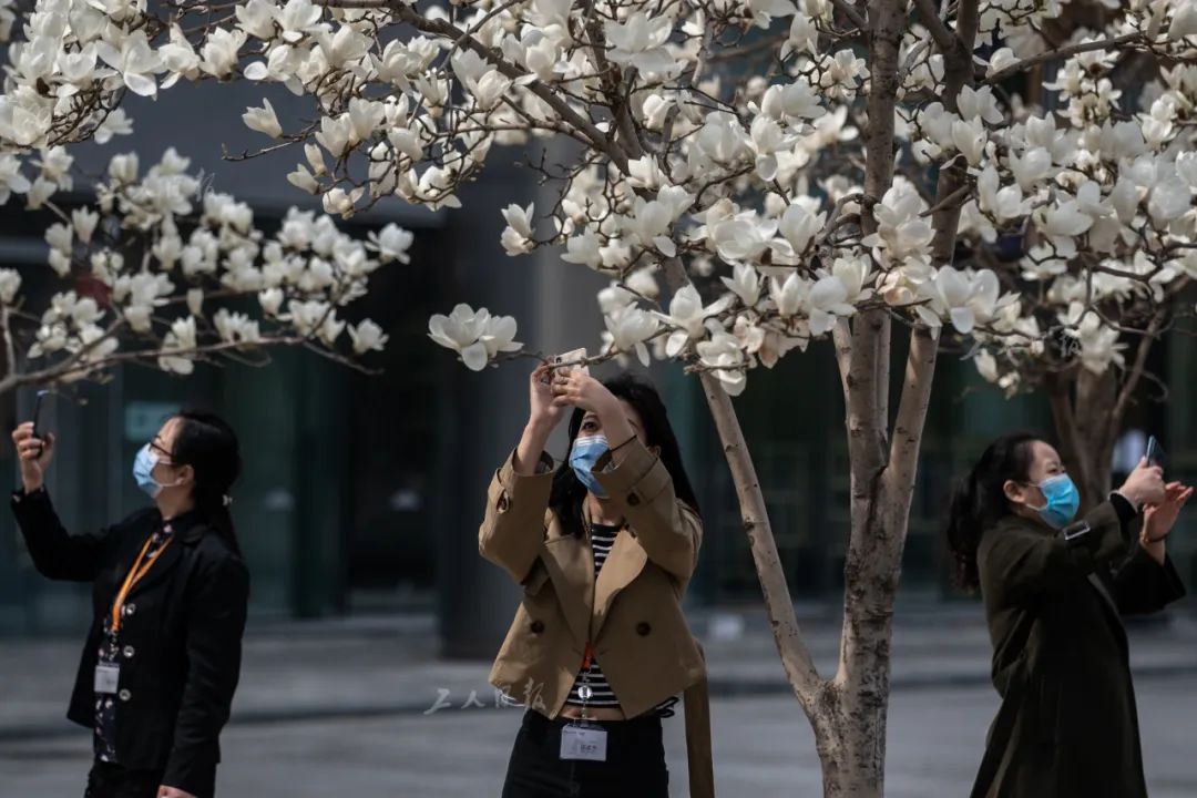 ↑3月30日,写字楼北侧盛开的白玉兰吸引了一些员工的注意,她们拿起手机拍照留念。