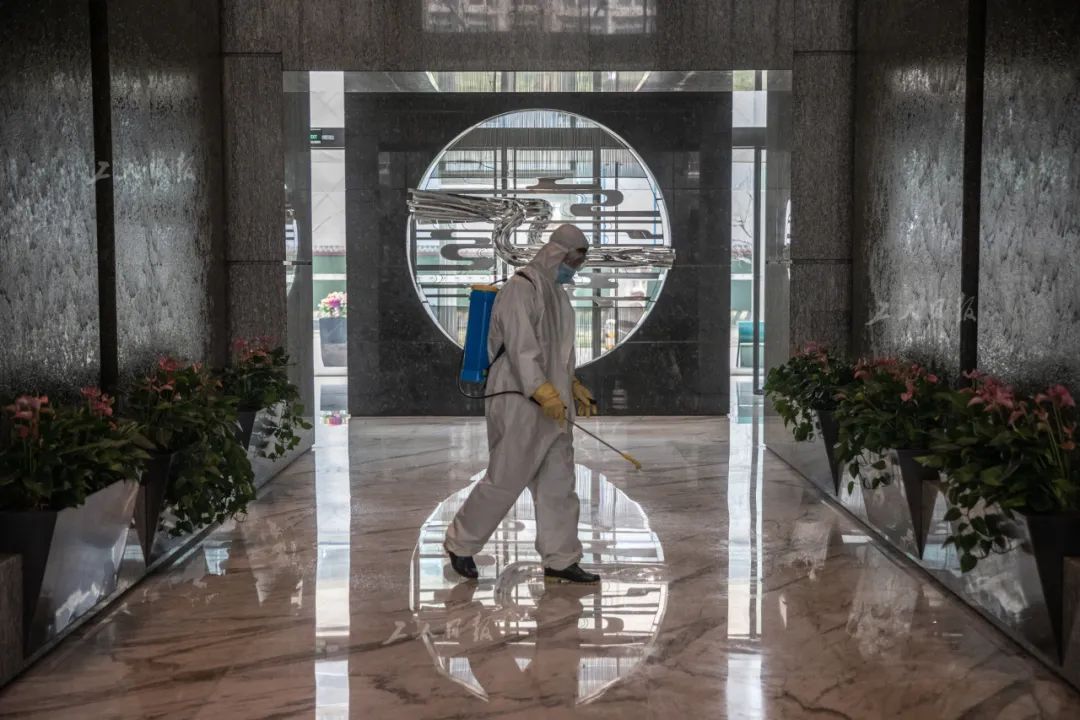 ↑3月30日上午,消毒员温俊海赶在员工上班前对一楼的大厅进行消毒。疫情期间,物业工作人员每天都会对楼宇进行三次消毒。