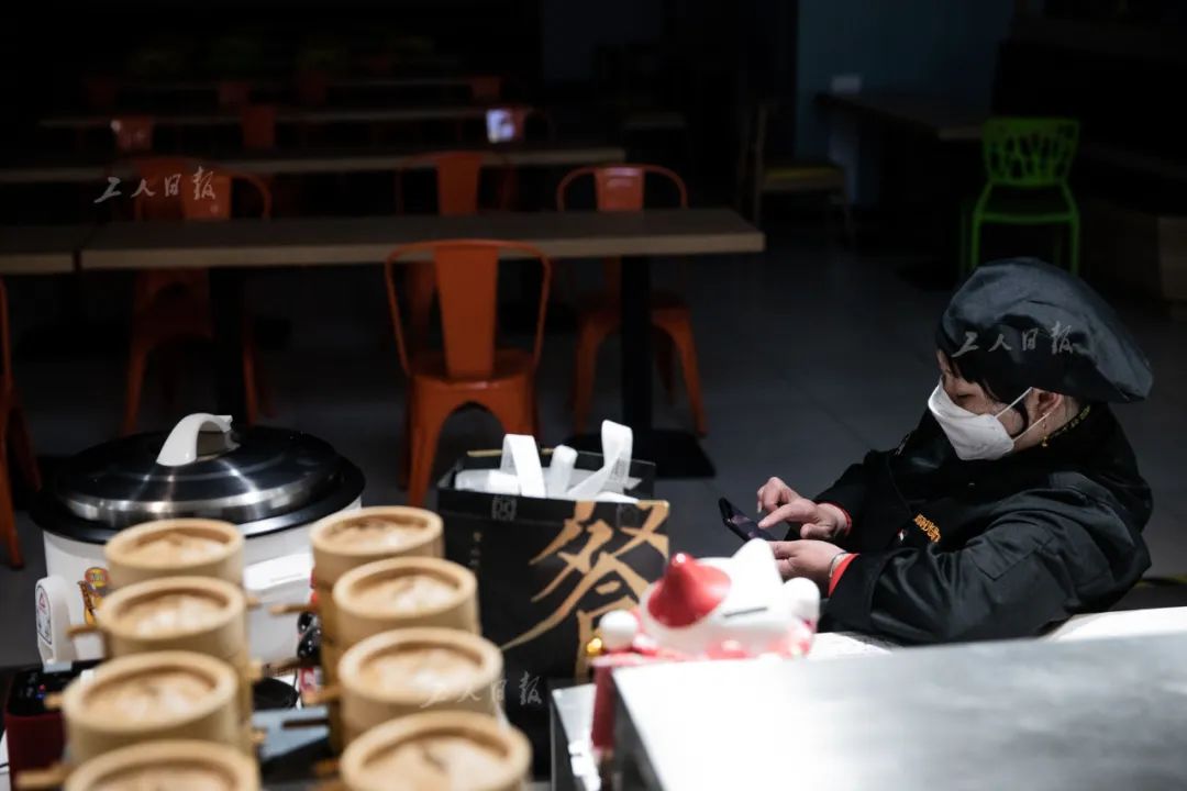 ↑4月1日,位于写字楼地下二层的一家美食城内,50岁的服务员冉菊花正通过外卖平台接收订单。
