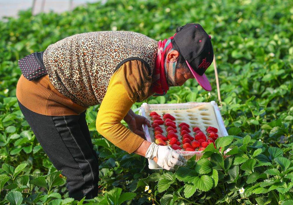 4月10日,丹东市圣野浆果专业合作社的工作人员在采摘草莓。近日,辽宁省东港市在做好疫情防控的同时,积极引导当地设施农业企业、合作社抢抓农时有序开展农业生产,帮助农民增收。(新华社记者龙雷摄)