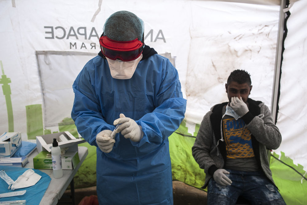 4月8日,在南非约翰内斯堡,一名医护人员给一名男子做新冠病毒检测。(新华社发)