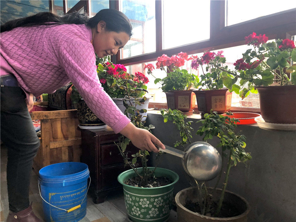 欧周永藏正在浇花。新华社记者白玛央措摄