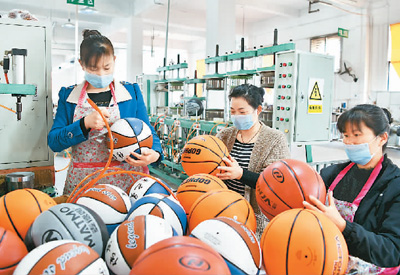 近期,湖北省通城县辉隆体育用品有限公司面对疫情,产品销售逆势上扬。该公司主要生产各种球类内胆和篮球,年产球类400万个,产值8000万元,出口创汇500万美元。图为工人在该公司加班加点赶制外贸订单。