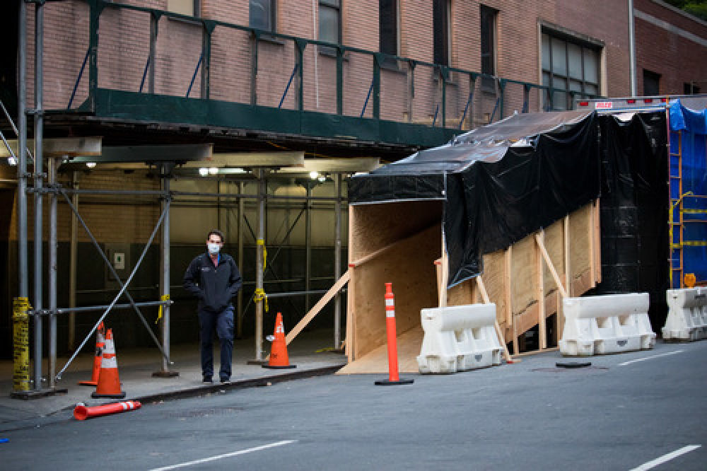 4月16日,在美国纽约一家医院外,一名戴口罩的行人从临时停尸房旁走过。新华社发