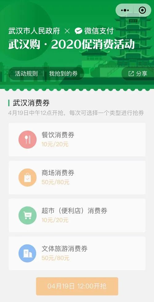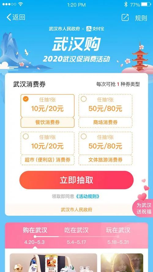 为活跃消费市场,从4月19日起,武汉市人民政府将陆续向全体在汉人员投放5亿元的“武汉消费券”,以支持全市商贸和文旅行业复工、复产、复市。