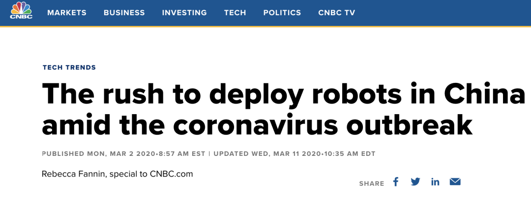 3月2日,美国消费者新闻与商业频道(CNBC)发文称赞中国的机器人在疫情期间展现出了“超强执行力”: