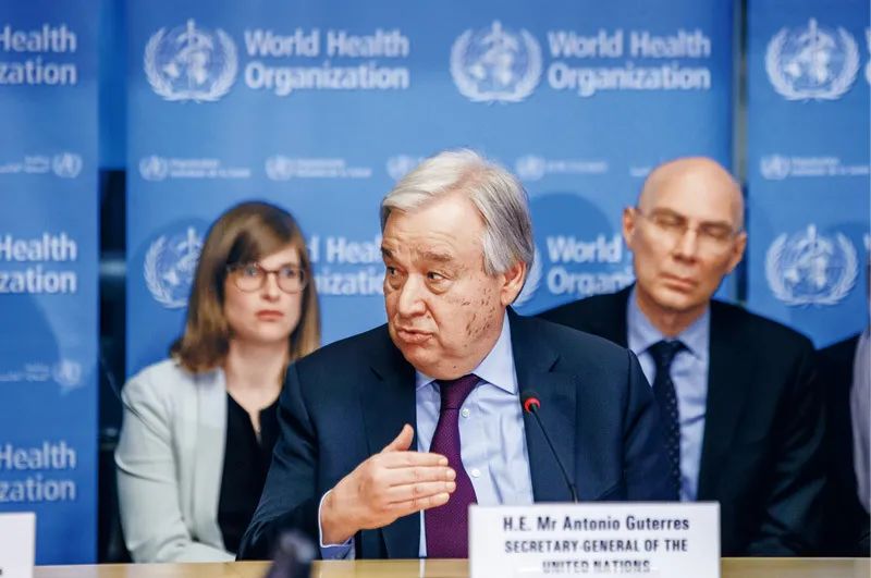 2020年2月24日,联合国秘书长古特雷斯(前)在瑞士日内瓦世界卫生组织总部发表讲话。古特雷斯表示,中国实施严格的防控措施,以牺牲正常生活的方式为全人类作出了贡献。新华社发