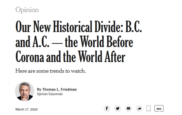 近日,《世界是平的》一书作者托马斯·弗里德曼在《纽约时报》发表专栏文章《我们新的历史分界线:“新冠前世界”与“新冠后世界”》。