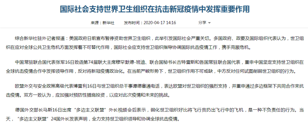 美国政府日前宣布暂停资助世界卫生组织,此举引发国际社会严重关切。多国政府、政要及国际组织代表认为,世卫组织在应对全球公共卫生危机方面发挥着不可替代作用,国际社会应支持世卫组织指导协调国际抗击疫情工作,携手克服危机。