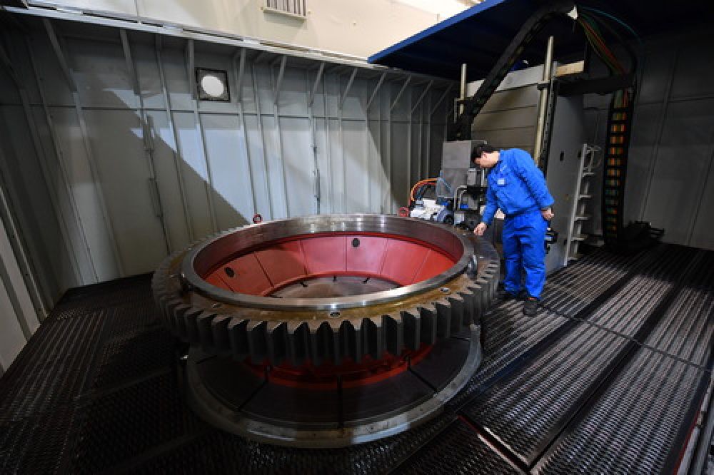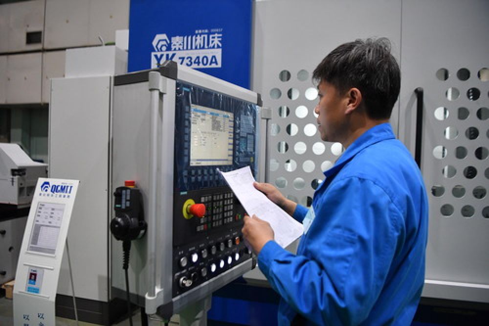 工作人员在陕西秦川机床工具集团股份公司秦川齿轮传动厂生产车间操作机床设备(2019年12月26日摄)。新华社记者 张博文 摄