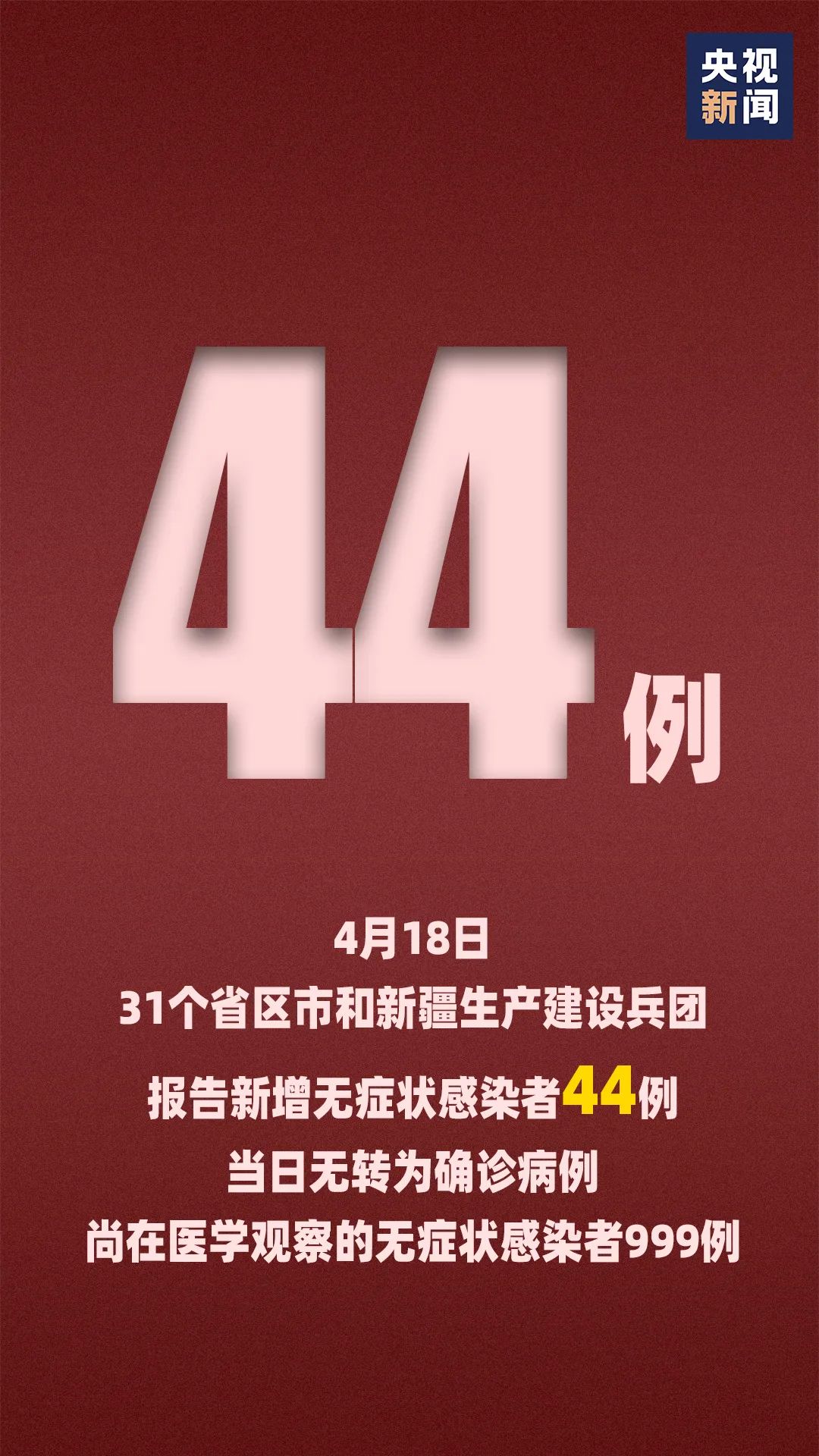 31个省(自治区、直辖市)和新疆生产建设兵团报告新增无症状感染者44例,其中境外输入无症状感染者3例;当日无转为确诊病例;当日解除医学观察62例(境外输入8例);尚在医学观察无症状感染者999例(境外输入186例)。