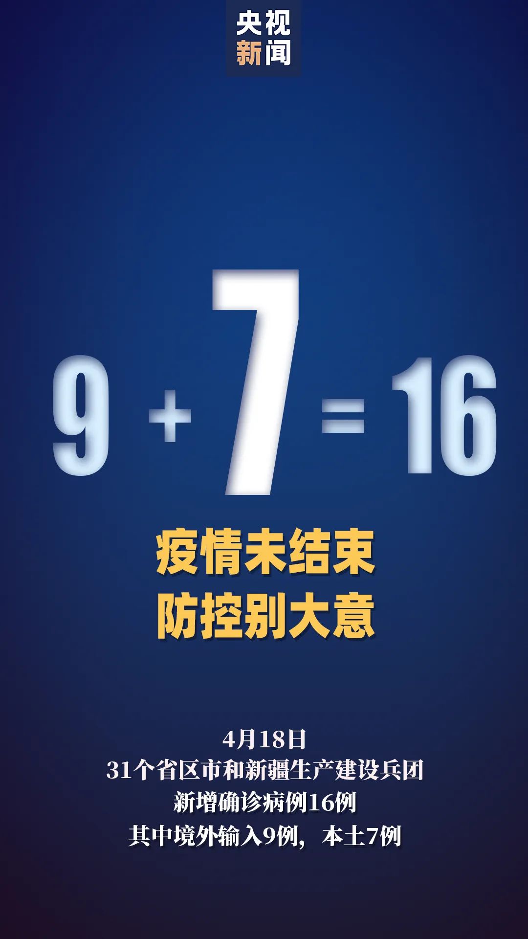 4月18日0—24时,31个省(自治区、直辖市)和新疆生产建设兵团报告新增确诊病例16例,其中9例为境外输入病例,7例为本土病例(黑龙江6例,广东1例);无新增死亡病例;新增疑似病例2例,其中1例为境外输入疑似病例,1例为本土疑似病例(内蒙古1例)。