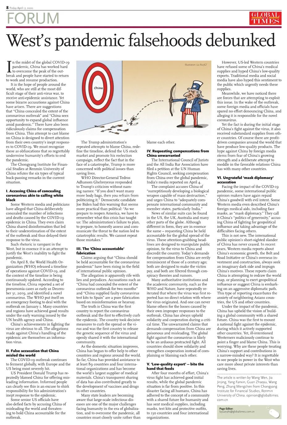 新冠疫情全球大流行中,中国经过艰苦努力,度过了疫情风险高发期,开始全面复工复产,成为仍处在“反病毒世界大战”最艰难阶段的各国人民获得抗“疫”援助的希望所在。然而,一些西方政客和媒体却假装看不见中国在抗“疫”中传递的充分信息和有效经验,抛出“中国隐瞒疫情”、“中国趁疫情之机扩张影响力”等奇谈怪论,甚至异想天开要“向中国索赔”,试图把自身抗“疫”不利的责任“甩锅”给中国。对于这些谬论,必须认清其混淆视听、破坏人类抗击病毒努力的实质,予以坚决回击。中国人民大学重阳金融研究院在