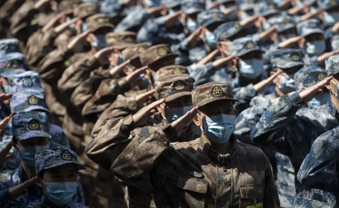 △4月15日,最后一批回撤的军队支援湖北医疗队队员向火神山医院敬礼告别。新华社记者 费茂华 摄