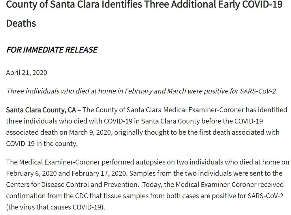 4月21日,美国加利福尼亚州旧金山湾区圣克拉拉县公共卫生部门发布公告,验尸官对该县2020年2月6日和2020年2月17日在家中死亡的两人进行了尸检,并将样本送交CDC检测。结果证实,二人均因感染新冠病毒死亡。