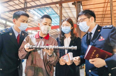 近期,四川省华蓥市税务部门携手农商行、建行、农行、工行,及时深入企业了解生产资金需求,并通过银税互动平台,推出多种纳税信用贷和抗疫贷产品,助推企业有序复工复产。图为华蓥市税务部门和工商银行员工在小微企业生产现场了解生产经营情况。邱海鹰摄(人民视觉)