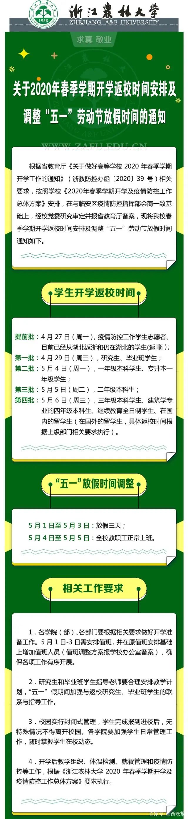 4月21日,浙江农林大学公布了本学期开学返校方案,学生实行分批返校,同时调整五一假期。这是浙江省内较早发布开学返校方案的高校。