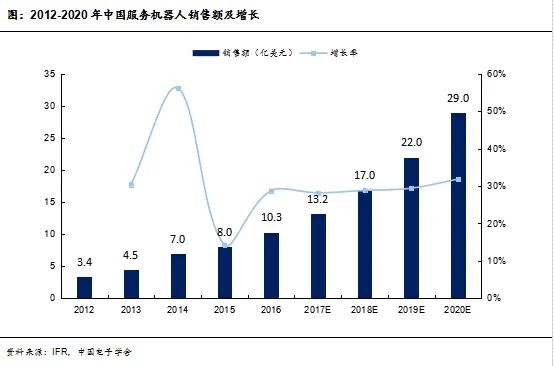 据中国电子学会统计,2012年-2020年,服务机器人在中国的销售额增速是世界总体增速的两倍多。2020年中国服务机器人的市场规模将达22亿美元,同比增长33%。