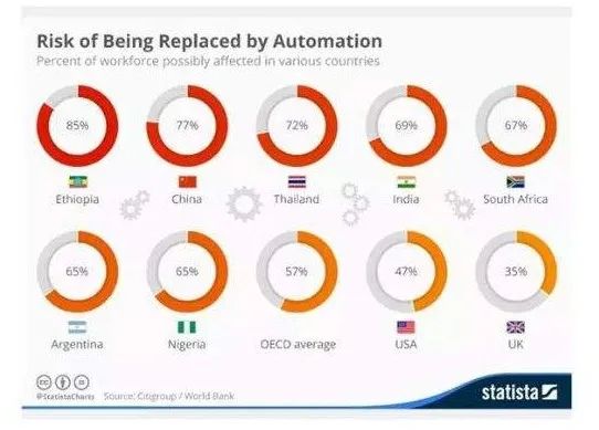世界银行预测,未来将有一些工作被智能机器取代,在中国,这个数字将超过77%。