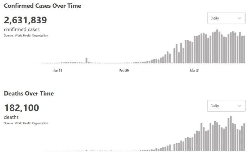 根据世卫组织最新实时统计数据,目前全球新冠肺炎累计确诊2631839例,累计死亡182100例。