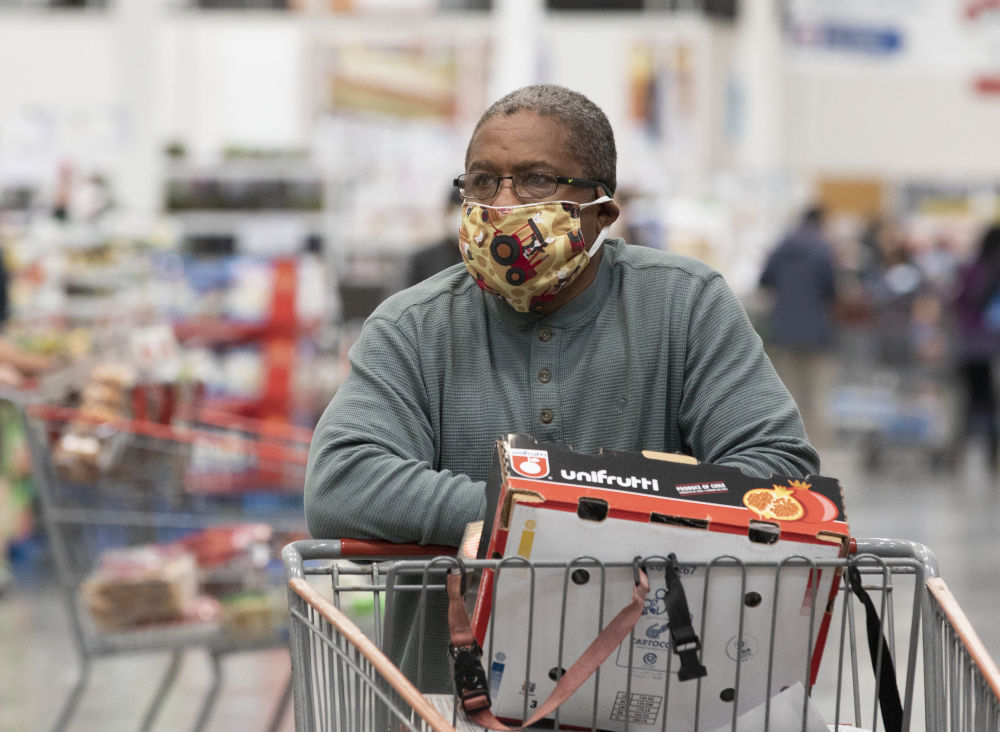 2020年4月22日,市民戴口罩在美国北加州旧金山湾区福斯特城一家超市购物。新华社发(李建国摄)