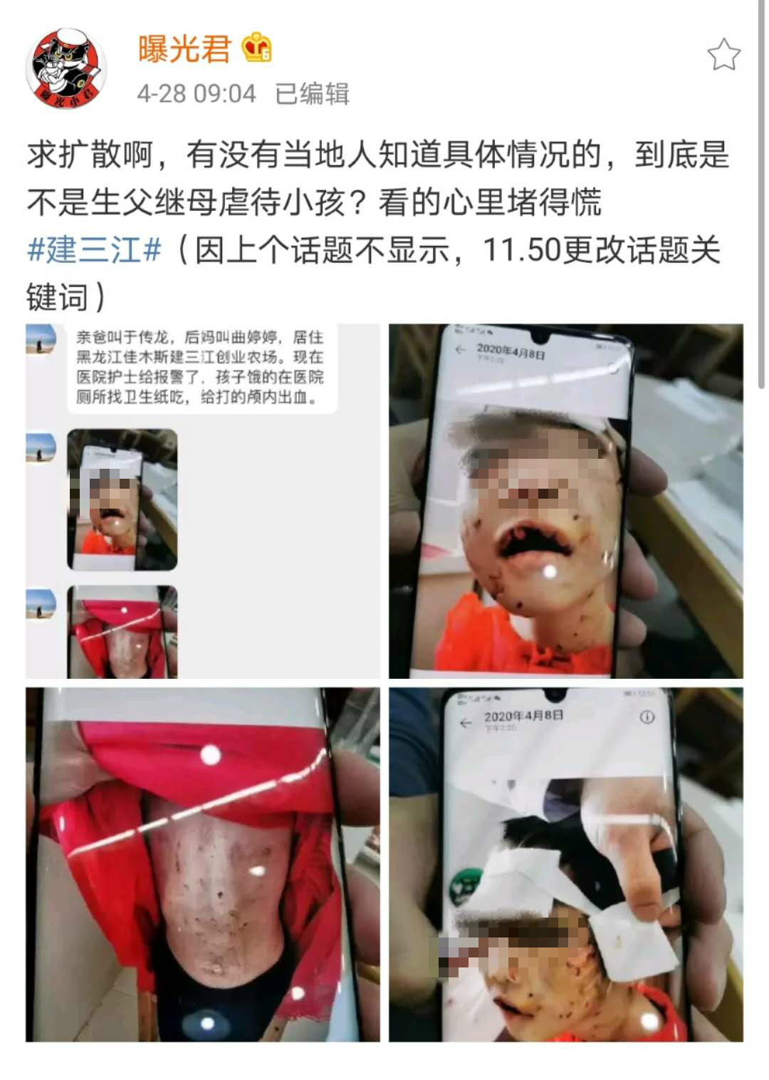 网传佳木斯建三江农场一4岁女童被虐打。@曝光君微博 图
