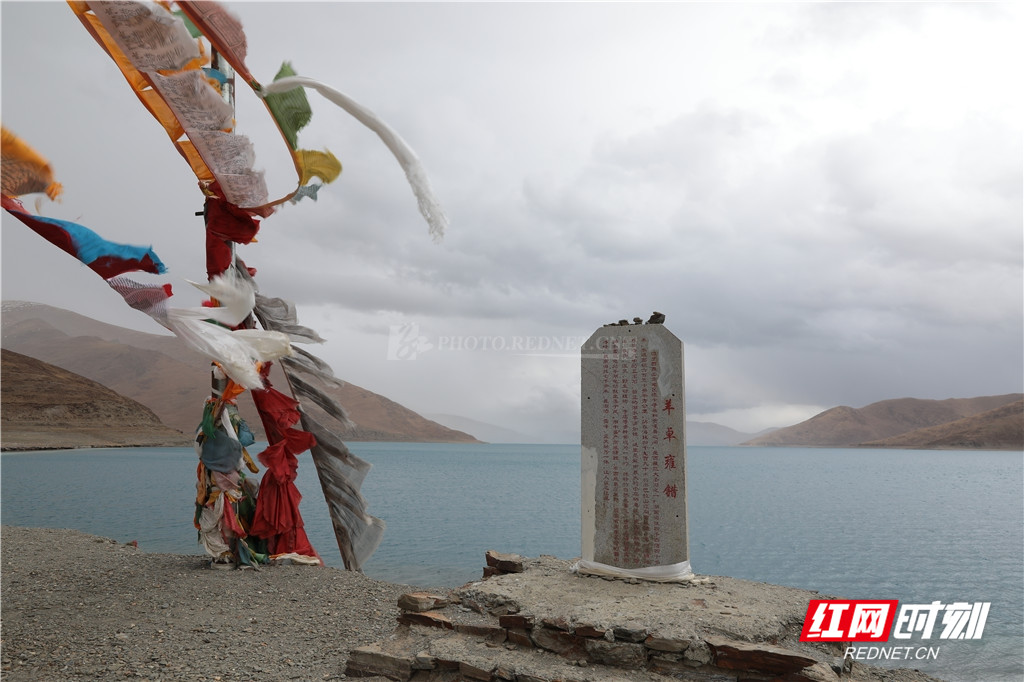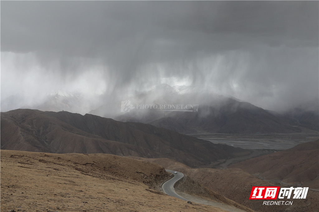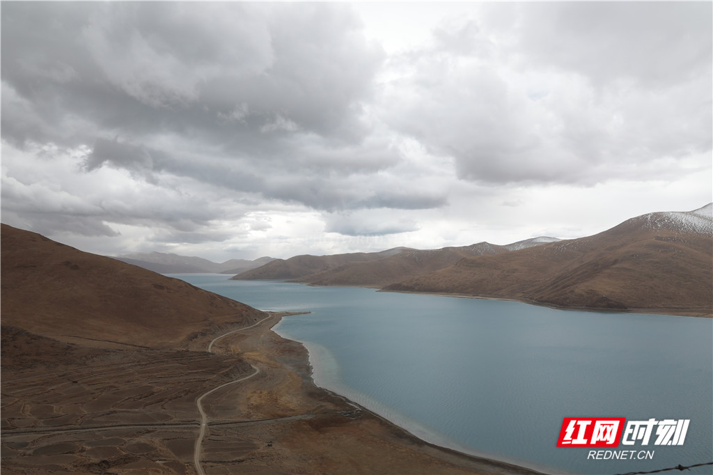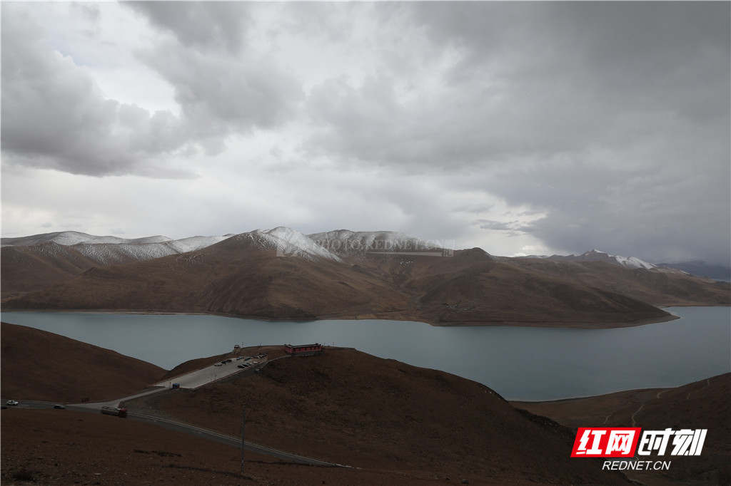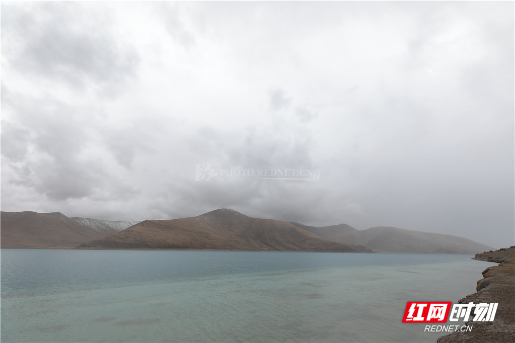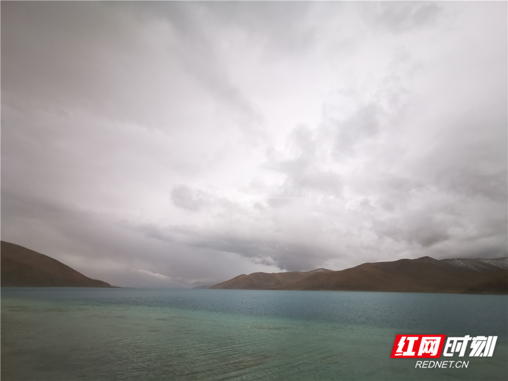 有人说,一千个人眼中就有一千个羊湖。摄影师银戈到过几次羊湖,每次看到的场景都不一样。蓝天无云的时候,羊湖的蓝摄人心魄,在阳光照射下变幻着层次极其丰富的蓝绿色,光影对比十分强烈,给人感觉充满青春的激情。此次抵达羊湖遇上多云天气,站在海拔5000米湖的垭口,只见大雨云从远处飘来,瞬间包裹住羊湖,云海如瀑布般洒向大地,起伏的山峦好似披着白纱的羞涩少女,此时此刻,全世界都仿佛变得秀丽而宁静。所有翻山越岭的疲惫被眼前的美景一扫而光,难道这就是“此景只应天上有”?
