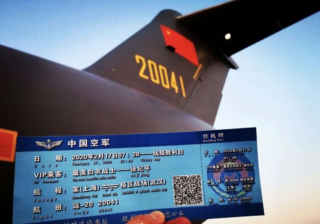 2月17日,空军出动运-20等三型多架运输机向武汉紧急空运军队,支援湖北医疗队队员和物资。每位乘机医务人员都拥有独一无二的VIP机票