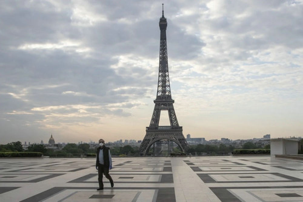 4月24日,一名戴口罩的男子走过巴黎埃菲尔铁塔附近的特罗卡德罗广场。(美联社)