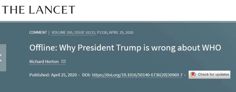 4月25日,国际权威医学杂志《柳叶刀》主编理查德·霍顿在该杂志上发表了题为《为什么特朗普总统关于WHO的说法是错的》的文章。