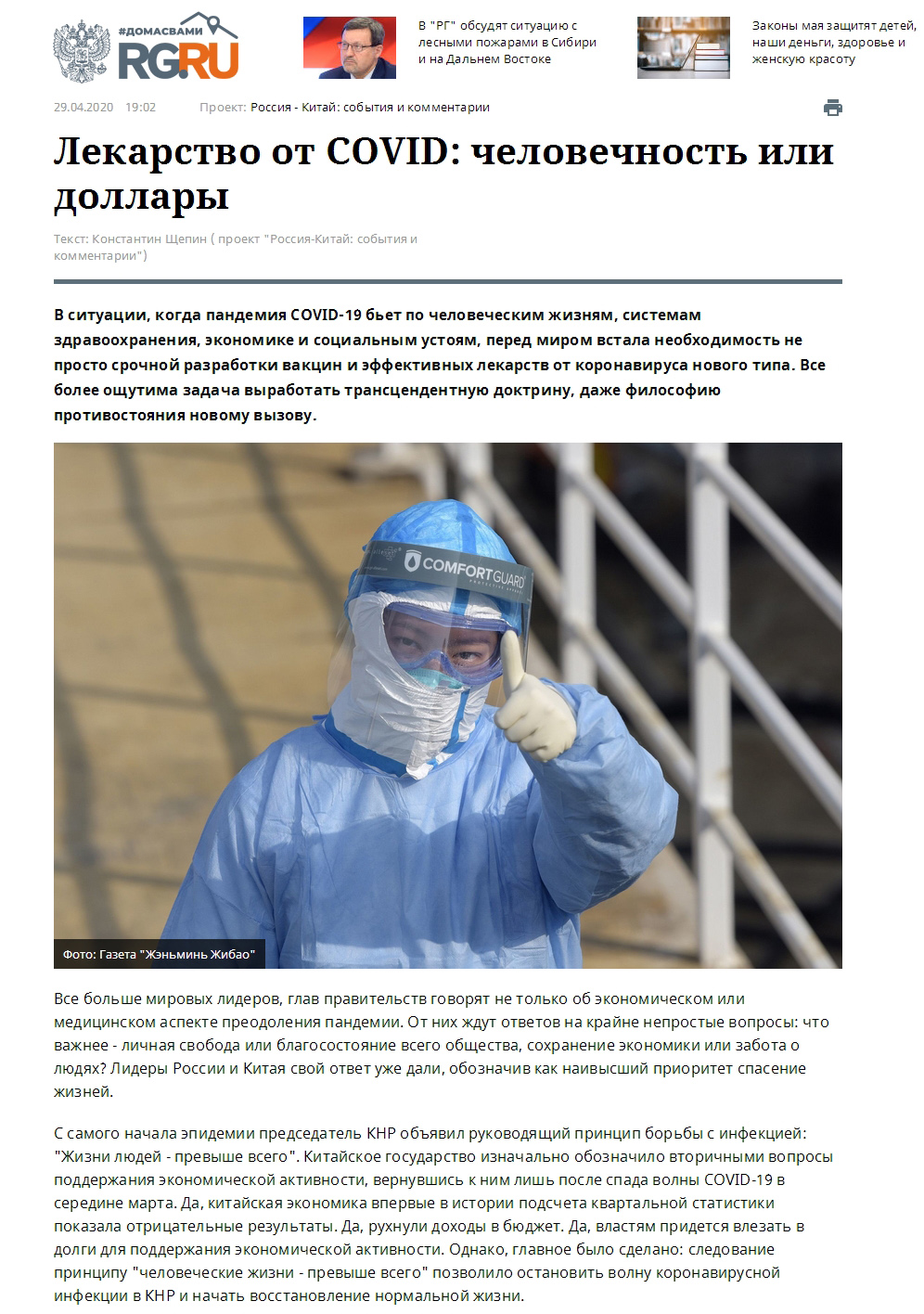 《俄罗斯报》网站29日刊发评论员康斯坦丁·谢平撰写的题为《战胜疫情的良药,是人性还是美元?》的署名文章。文章称,面对疫情,中俄两国坚定秉持“生命至上”原则,携手应对疫情。文章从道德和传统价值观维度对美国经济优先,而非生命至上的选择进行了分析,同时对其污蔑抹黑中国的企图进行了有力批驳。全文编译如下: