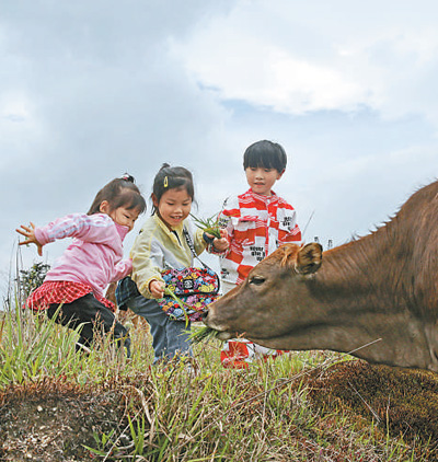 “五一”假期,湖南省桂东县一些群众走出家门,体验近郊游。图为小朋友在桂东县某生态体验区喂牛。邓仁湘摄(影像中国)