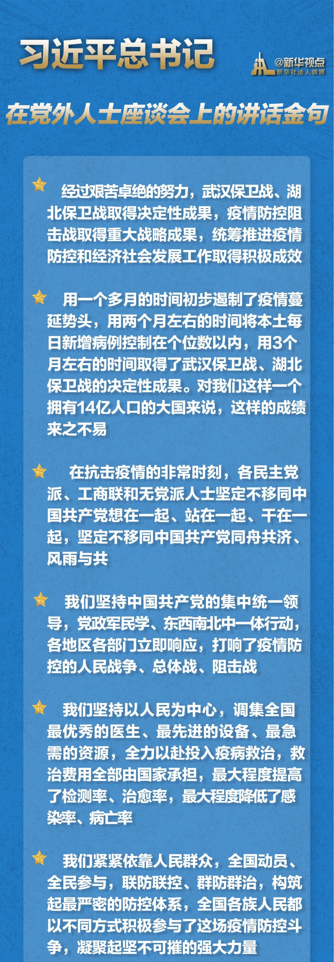 时刻新闻 —分享— 5月8日,中共中央在中南海召开党外人士座谈会,就新冠肺炎疫情防控工作听取各民主党派中央、全国工商联和无党派人士代表的意见和建议。在会上,习近平总书记的重要讲话鼓舞人心! 来源:新华视点 编辑:张天野