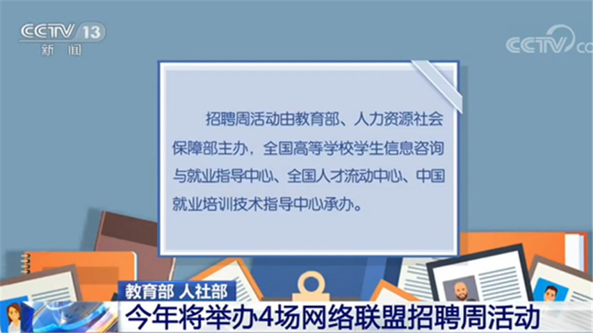 央视网消息:近日,教育部办公厅、人力资源社会保障部办公厅联合下发《关于举办2020年全国高校毕业生就业网络联盟招聘活动的通知》,今年将举办4场联合招聘周活动。