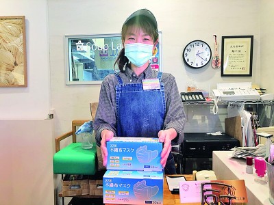 4月24日,在日本静冈县静冈市,拉面馆“面屋厨”的店员接受中国客人捐献的口罩。新华社发