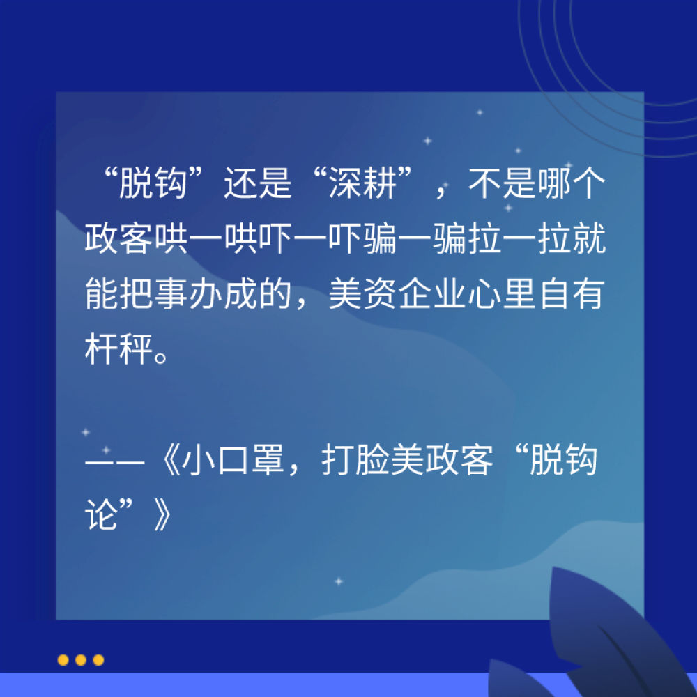 伴随中国改革开放而分享合作共赢“蛋糕”的美国企业,也未见得太把“脱钩论”当回事。这不,就在前几天,埃克森美孚在粤港澳大湾区投资建设的广东惠州乙烯项目举行“云开工”仪式,总投资约100亿美元。更早一些的4月8日,武汉“解封”当天,另一家美国企业沃尔玛就宣布将在武汉扩大投资30亿元。中国美国商会、上海美国商会和普华永道中国17日发布的联合调查报告显示,受访的在华美国企业中,超过70%表示不会因为疫情影响而将生产、供应或采购业务迁至海外。即便美国政府愿意为美企撤离埋单,美企也不见得会对撤离买账。“脱钩”还是“深耕”,不是哪个政客哄一哄吓一吓骗一骗拉一拉就能把事办成的,美资企业心里自有杆秤。