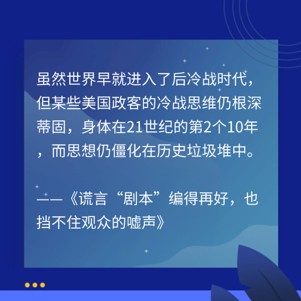 虽然世界早就进入了后冷战时代,但某些美国政客的冷战思维仍根深蒂固,身体在21世纪的第2个10年,而思想仍僵化在历史垃圾堆中。这次,他们从垃圾箱里翻出谎言串联的“逢中必反”剧本,更糟糕的是,这是在全球面临新冠肺炎疫情严峻考验的情况下编造的。