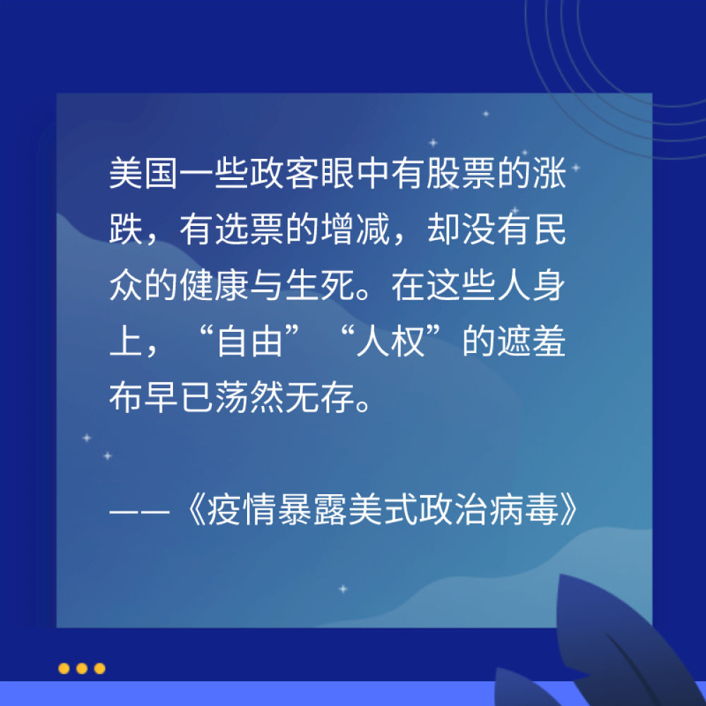 美国一些政客眼中有股票的涨跌,有选票的增减,却没有民众的健康与生死。他们相信“美国拥有远远大于其他国家的实力”,凭借强权就可以“通吃天下”,就可以凌驾于国际道义公理与规则体系之上,就可以靠“丛林法则”横行天下。在这些人身上,“自由”“人权”的遮羞布早已荡然无存。