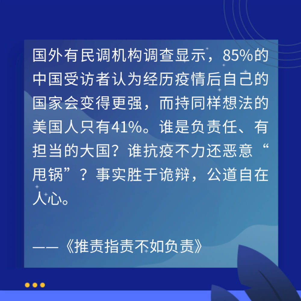 国外有民调机构调查显示,85%的中国受访者认为经历疫情后自己的国家会变得更强,而持同样想法的美国人只有41%。谁是负责任、有担当的大国?谁抗疫不力还恶意“甩锅”?事实胜于诡辩,公道自在人心。