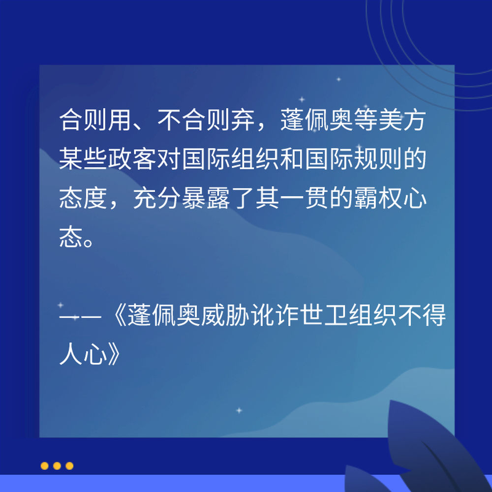 自恃世卫组织主要出资国,认为世卫组织应该听其指挥,这是典型的霸权心态;因为世卫组织坚持客观公正立场、对美方不予迎合,就停止捐资,这是典型的威胁和讹诈。