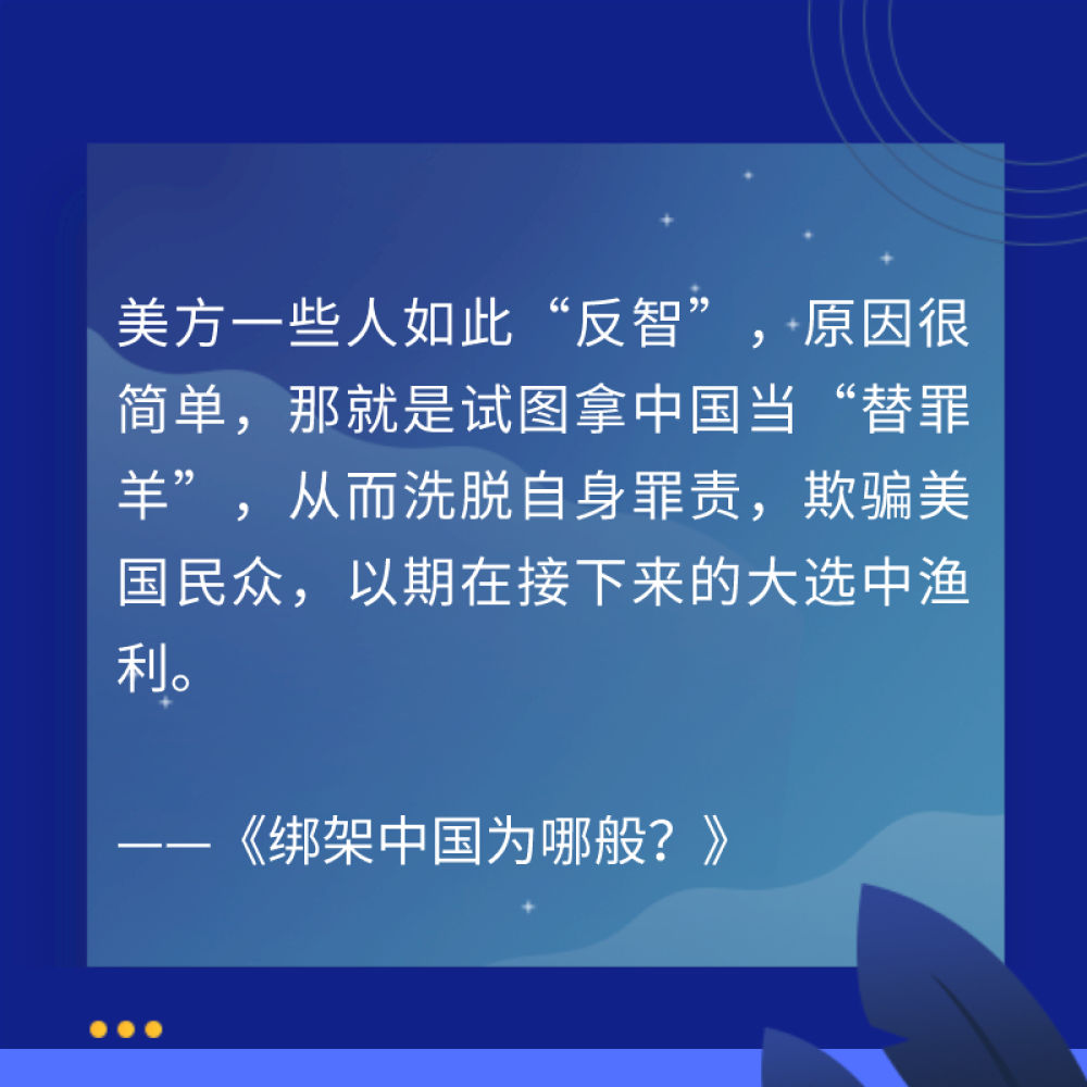 美方一些人如此“反智”,原因很简单,那就是试图拿中国当“替罪羊”,从而洗脱自身罪责,欺骗美国民众,以期在接下来的大选中渔利。