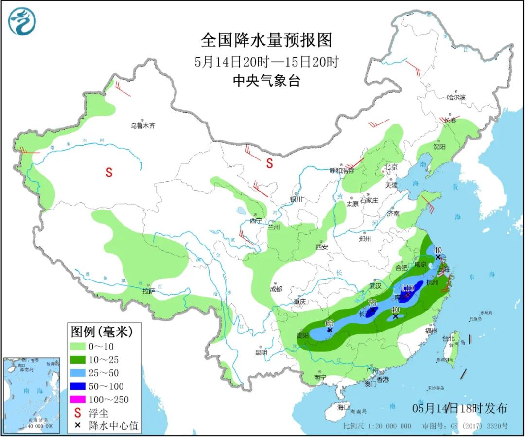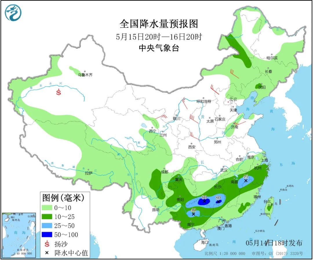 20-22日,江南、华南还将有一次较强降雨过程,江南南部、华南中北部等地有暴雨或大暴雨。