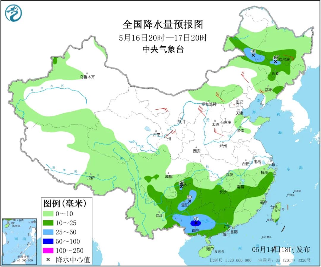 16-18日,江南、华南等局地有暴雨或大暴雨并伴有短时强降水、雷暴大风或冰雹等强对流天气。