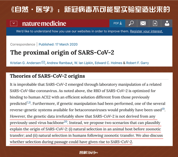 2020年3月17日,《自然·医学》杂志刊发美国、英国、澳大利亚5位权威科学家的研究论文证明,新冠病毒不可能是实验室造出来的,可能是病毒对人或动物宿主的自然选择。 人民网供图 王政淇/制图