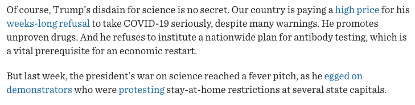 当然,特朗普对科学的蔑视不是秘密。尽管有诸多警告,他在长达数周内都未能认真应对COVID-19,为此美国付出了高昂的代价。他提倡未经证实的药物。他拒绝制定全国性的抗体检测计划,尽管这是经济重启的重要前提。