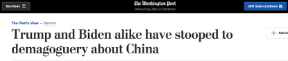 为了在竞选初期占据优势,特朗普总统和民主党预先推定的候选人乔·拜登都毫不犹豫地采取了一个轻松而卑鄙的策略:指责对方是中国的走狗。特朗普的竞选团队正在推广“北京拜登”的话题标签,同时声称这位前副总统对中国素来温和。拜登和支持他的一个超级政治行动委员会则用令人生厌的广告予以回应,称“特朗普在新冠病毒疫情中‘听命于中国人’,并‘把我们的(医疗)物资送给中国’”。