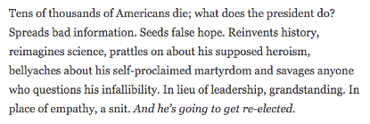 成千上万的美国人在死去,而总统做了什么呢?散布不实信息。传播错误希望。重新创造历史,重新幻想科学,对自以为是的英雄主义喋喋不休,抱怨自己所做的牺牲以及攻击任何质疑他的人。没有领导力,只有哗众取宠。没有共情,只有窃笑。就这样,他还想要连任。
