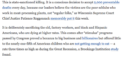 这是一场国家批准的屠杀。特朗普政府认为,每天新增2,000例本可避免的死亡是可以接受的。他们认为受害者是在肉类加工厂工作的蠢货,而不是如威斯康星州最高法院首席法官佩兴司·罗根萨克所指的“普通人”,这一表述令人印象深刻。