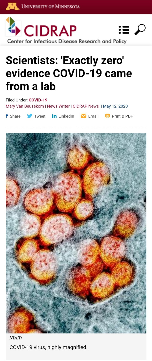 △美国明尼苏达大学传染病研究及政策中心:没有任何证据表明新冠病毒来自实验室。